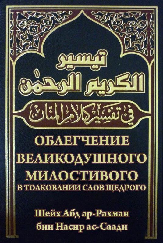 Книга шейха Абд ар-Рахмана бин Насира ас-Саади (да помилует его Аллах) "Облегчение от Великодушного и Милостивого" является одним из глубоко научных, широко распространенных и признанных исламской уммой толкований Священного Корана. Этот труд написан простым языком и потому доступен для самого широкого круга читателей. Истолковывая аяты, автор опирался в первую очередь на сам Священный Коран, затем на достоверные хадисы пророка Мухаммада, да благословит его Аллах и приветствует, и, наконец, на высказывания его сподвижников, да будет доволен ими Всевышний Аллах.
