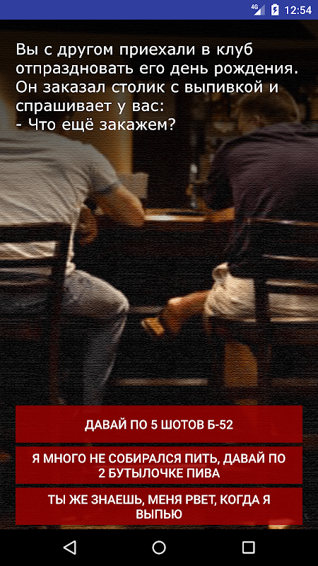 Это приложение предлагает вам пройти историю парня, который приехал в клуб на вечеринку. Выбирайте варианты ответа и проходите дальше по сюжету.
