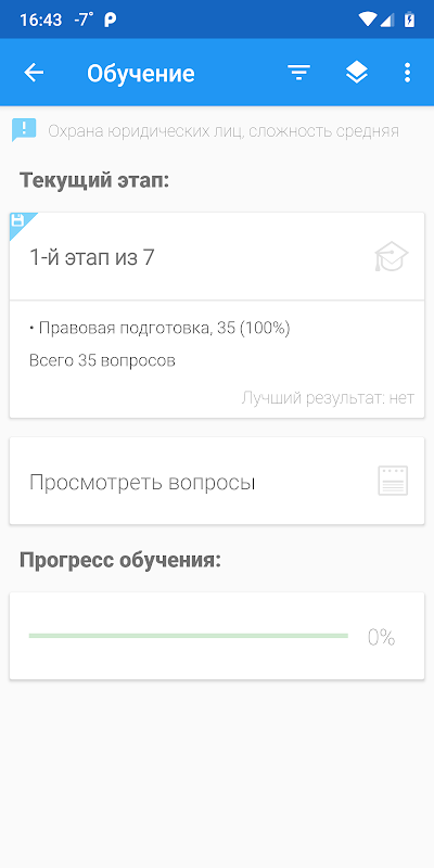 - режим "Обучение", который позволяет поэтапно изучить все вопросы выбранной категории