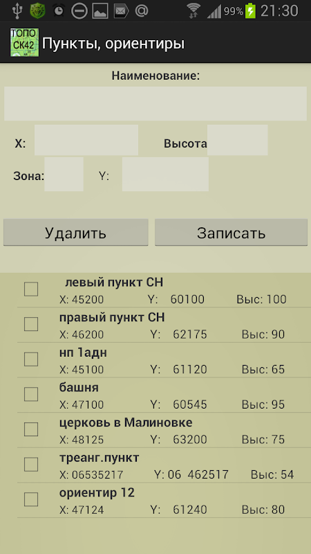 Khi bạn chạm vào bản đồ, hình chữ nhật (trong SK-42) và tọa độ trắc địa của địa điểm được hiển thị.