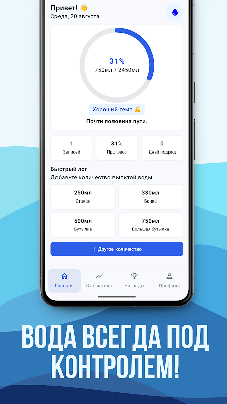 3. Отмечайте каждый выпитый стакан — наблюдайте за прогрессом và серией дней.