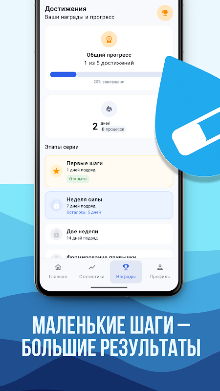 - Серии и достижения: этапы (“Первые шаги”, «Неделя силы», «Месяц успеха») và текущая серия дней.