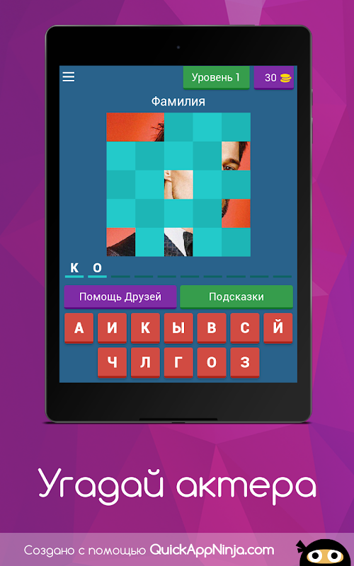 Угадай российского актера - это классическая андройд-викторина, в которой тебе предстоит угадать знаменитых актеров по фотографии. Фотографии актеров скрыты за плитками. Постарайся угадать фамилию актера, открыв как можно меньше плиток. Чем меньше плиток ты открываешь, тем больше монет получаешь.