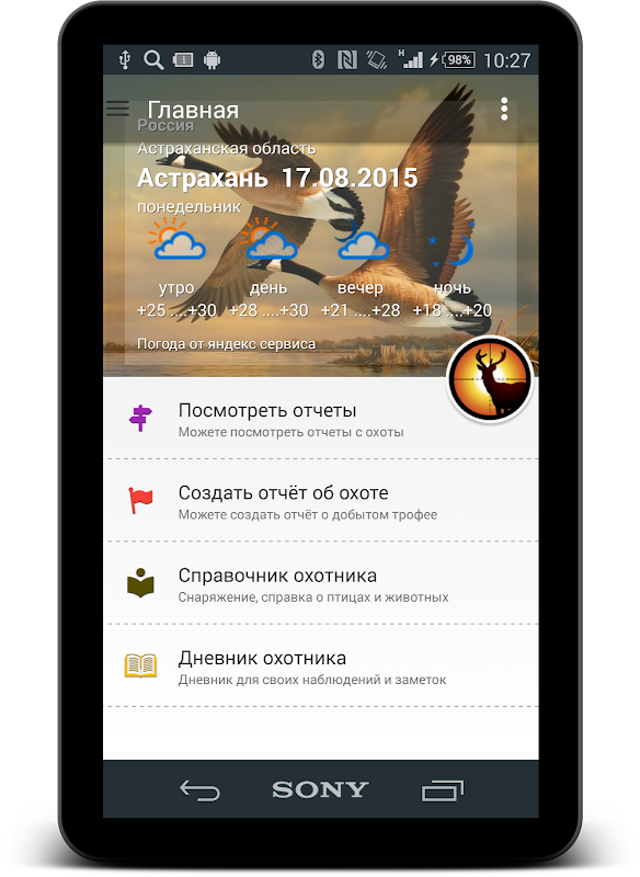 Приложение для истинных охотников, поможет не только отыскать место охоты на карте (каждое место на карте указано пользователями приложения, поэтому всё зависит от Вашего отчёта и добавления новых мест на карту), но и так же предусмотрено создание своего отчёта или отзыва о том месте охоты где в данный момент охотишься, или когда либо охотился. Так же данное приложение позволяет вести свой дневник наблюдений в зависимости от времени года, погоды, температуры и т.д. Данные о погоде сами подгружаются для места где именно находишься или можно их обновить с помощь предусмотренного функционала.