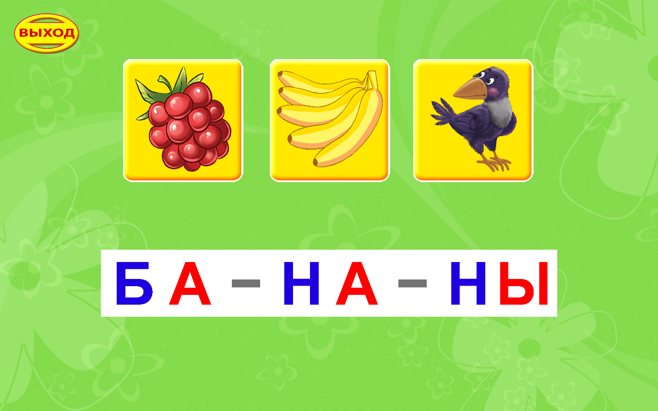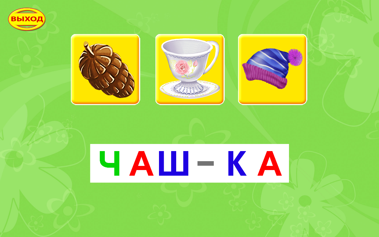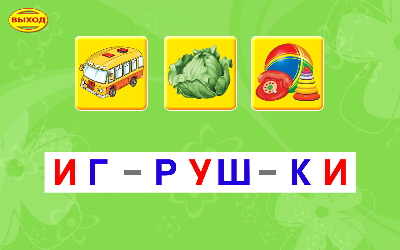 Đơn đề nghị học tập để đọc chữ. Trên màn hình của đứa trẻ nhìn thấy từ, mà được chia thành âm tiết, và ba hình ảnh, một trong số đó cho thấy ý nghĩa của từ này. Trẻ em nên đọc văn bản và bấm vào hình ảnh chính xác. Từ trong ứng dụng được sắp xếp theo thứ tự tăng đọc khó khăn. Đầu tiên là những từ gồm hai âm tiết mở, sau đó từ với một âm tiết khép kín. tính năng từ xa hơn gồm ba âm tiết và âm tiết, vv đỏ đánh dấu nguyên âm, xanh dương - .. phụ âm cứng, và màu xanh lá cây - phụ âm mềm. Dần dần di chuyển từ đơn giản hơn để từ phức tạp, các bé sẽ được học để nhanh chóng đọc các từ với các loại khác nhau của âm tiết.