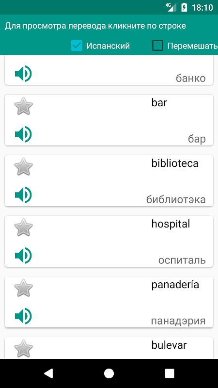 Đơn giản và tiện lợi chế độ tập luyện. Mở chủ đề mà bạn quan tâm, tìm hiểu các từ. Khi quyết định tự mình kiểm tra, thiết lập tại các nhãn hiệu hàng đầu trong "Nga" sẽ chỉ còn từ Nga như thể trước mặt bạn một hướng dẫn hoặc một phác thảo, và bạn có bàn tay nắm lại dịch để kiểm tra chính mình. Bạn có thể dịch một từ? -Excellent, Tiến tới tiếp theo. Bạn không thể chuyển hoặc nghi ngờ? - Nhấn vào trên đường, nơi có những từ thích hợp và ứng dụng sẽ mở dịch của từ. Tương tự như vậy, đặt một dấu kiểm trong "Tây Ban Nha" - vẫn chỉ là lời nói trong tiếng Tây Ban Nha và phiên mã. Một tính năng hữu ích cho những từ học: nếu bạn đặt một dấu ấn trong lĩnh vực "Shuffle", theo lời của chủ đề sẽ được hiển thị theo một thứ tự ngẫu nhiên.