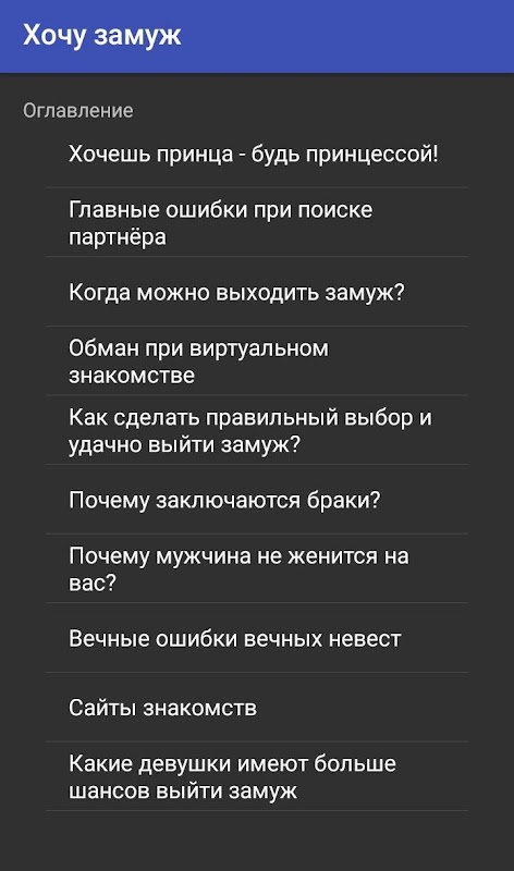 Приложение рассказывает о том как найти жениха, о психологии мужчин, об ошибках женщин и даёт полезные советы для желающих выйти замуж. Также приложение поможет стать вам хорошей, верной и любящей женой.