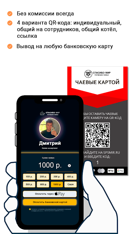 Сервис онлайн-чаевых для ресторанов, курьеров, отелей, салонов красоты, автозаправщиков, автомойщиков и других компаний.