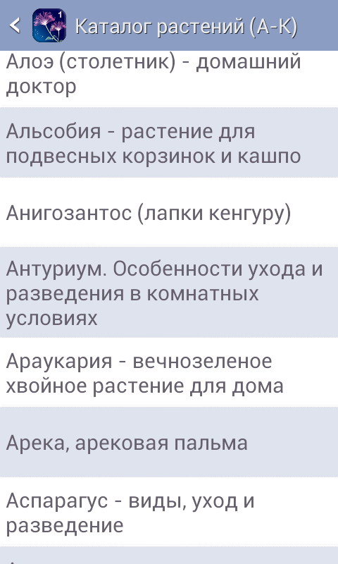 Do số lượng lớn các bức ảnh của ứng dụng được chia thành hai phần. Phần thứ nhất chứa một danh mục thực vật từ A đến K, thứ hai - từ K đến Z