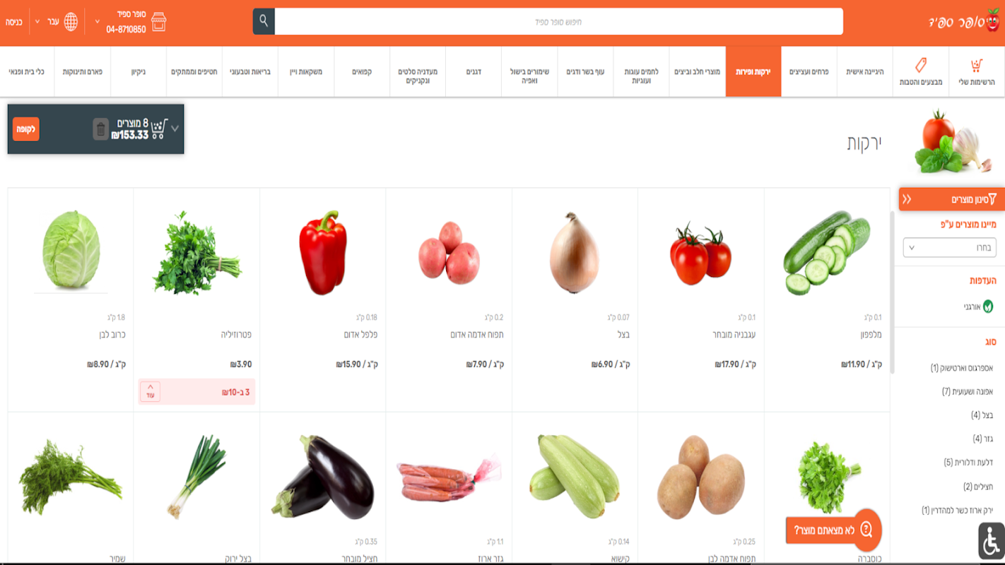 Đơn hàng của chúng tôi bao gồm các sản phẩm tươi sống được lựa chọn cẩn thận và tỉ mỉ. Nhóm khách hàng của chúng tôi được hưởng lợi từ nhiều đợt giao hàng đến khu vực Kiryat, giao hàng hàng ngày và dịch vụ khách hàng lịch sự với phản hồi nhanh chóng.