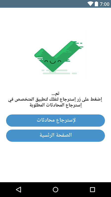 اليوم قد حصلت على هذا البرنامج المتخصص وسهل في استرجاع المحادثات والرسائل المحذوفة من الهاتفك الدي سوف يشتغل معك جيدا فلقد قمنا بتجربته علي انواع كثيرة من الهواتف واشتغل معهم جيدا وأيضا قدم للكثير من مستخدمين لهذا البرنامج في المتخصص في استرجاع محادثاتهم للوتس أب او الفيسبوك او حتى صورهم وسوف يساعدك انتا ايضا فقط لأن تطبيقنا يعمل على توفير التطبيق المناسب حسب اختياراتك يكفي الأن أن تقوم بتحميله واسترجاع المرسلات الخاصة ب messangen watsa او messanger يكفيك الدخول إلى تطبيق وتبع المراحل وسترجع المحادثات والرسائل ثم قم بإرساله لأصدقائك على واتس أو أي تطبيق آخر للتواصل الاجتماعي.