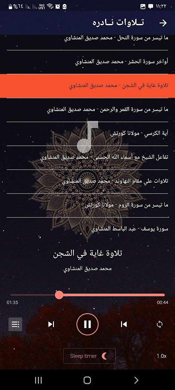 Chúng tôi đã thu thập cho bạn trong ứng dụng những bài tụng niệm hiếm hoi đẹp nhất, một số lượng rất lớn các bài tụng và buổi hòa nhạc từ một số lượng rất lớn các Sheikh của thế giới Hồi giáo, chẳng hạn như Sheikh Abdel Basit Abdel Samad, Sheikh Muhammad Siddiq Al-Minshawi, Sheikh Mahmoud Khalil Al-Husari, Sheikh Mahmoud Ali Al-Banna, Sheikh Mustafa Ismail, Sheikh Muhammad Refaat, Sheikh Kamel Youssef Al-Bahtimi, Sheikh Abu Al-Ainin Shaisha, Sheikh Mahmoud Al-Shahat Anwar, Sheikh Muhammad Shabib, Sheikh Antar Muslim, Sheikh Sayyed Metwally và nhiều người khác.