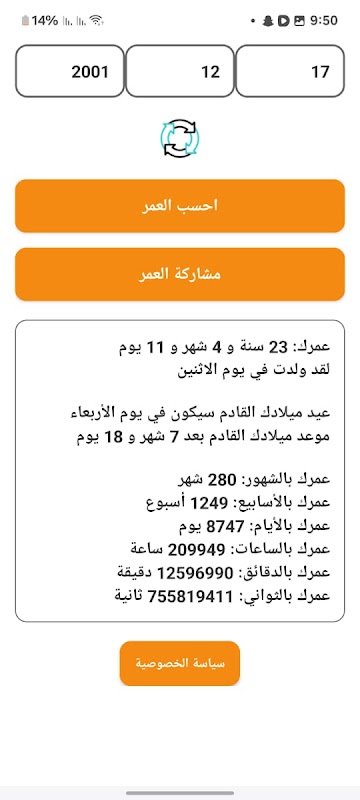 Một ứng dụng dễ dàng và trực tiếp để tính chính xác tuổi của bạn bằng cách nhập thủ công ngày sinh của bạn (ngày, tháng, năm), với khả năng chia sẻ kết quả trên các ứng dụng khác như WhatsApp, Facebook hoặc Instagram.