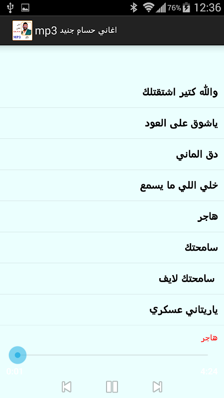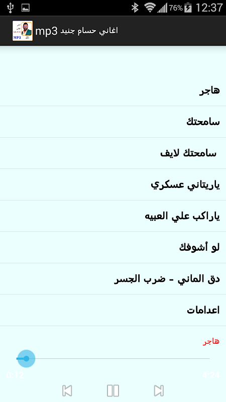 تطبيق ( اغاني حسام جنيد mp3 ) يمكنك من الإستماع لجميع أغاني المغني السوري الشهير حسام جنيد بجودة صوت عالية وبصيغة mp3 .
