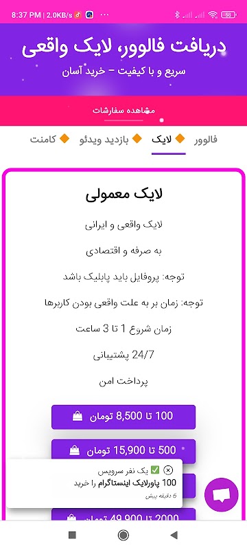 با این برنامه میتونید بسته های متنوع لایک و فالوور و کامنت و ... را براحتی استفاده کنید.
