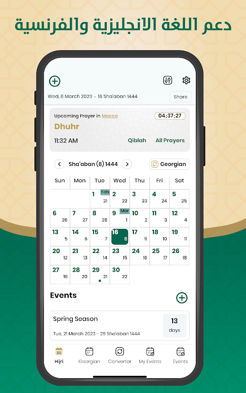 Hiển thị lịch Hijri và Gregorian, chuyển đổi ngày, các sự kiện công khai và đặc biệt.