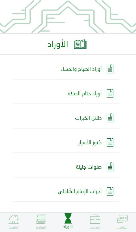 Ứng dụng này cũng bao gồm một định nghĩa về phương pháp và hình tượng của nó là Shamkh Abi al-Hasan al-Shazli và Shaykh al-Imam. Ali Gomaa và Sindha liên quan đến sứ giả của chúng ta về Allah. Ứng dụng này có chứa một số cuốn sách giúp các tông đồ trong cách hành vi của mình với Thiên Chúa để đi bộ nhận thức. Ngoài ra còn có thời gian cầu nguyện và hồ bơi điện tử. Chúng ta cầu xin Đức Chúa Trời giúp đỡ cho Vị Tiên Tri để đề cập đến Đức Chúa Trời nhiều như Đức Chúa Trời Toàn Năng: "Ôi những người tin, hãy nhớ Đức Chúa Trời rất nhiều"