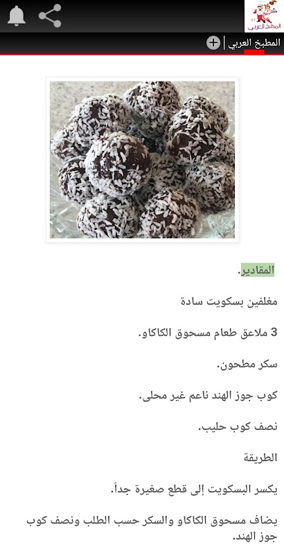 - Ứng dụng các công thức nấu ăn bao gồm các món ăn chính của Ả Rập và quốc tế ngon miệng như các món ăn Levantine, Libya, Tunisia và Algeria, các món ăn Trung Quốc và Ý, và những món ăn khác.