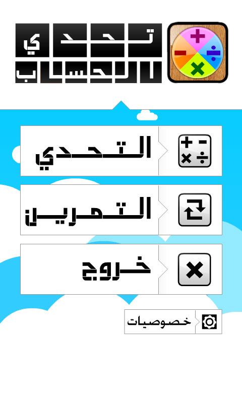 تحدي الحساب هي لعبة رياضيات و حساب باللغة العربية الهدف منها هو تعليم الأطفال و حتى البالغين الحساب الذهني ، تعلم العمليات الحسابية : الجمع ، الطرح الضرب و القسمة , كما يمكنك تعلم الأس و الجذر للمستويات الصعبة بنوعين من الكتابة : الأرقام العربية (1 2 3 ...) أو الأرقام الهندية (۱ ۲ ۳ ٤)