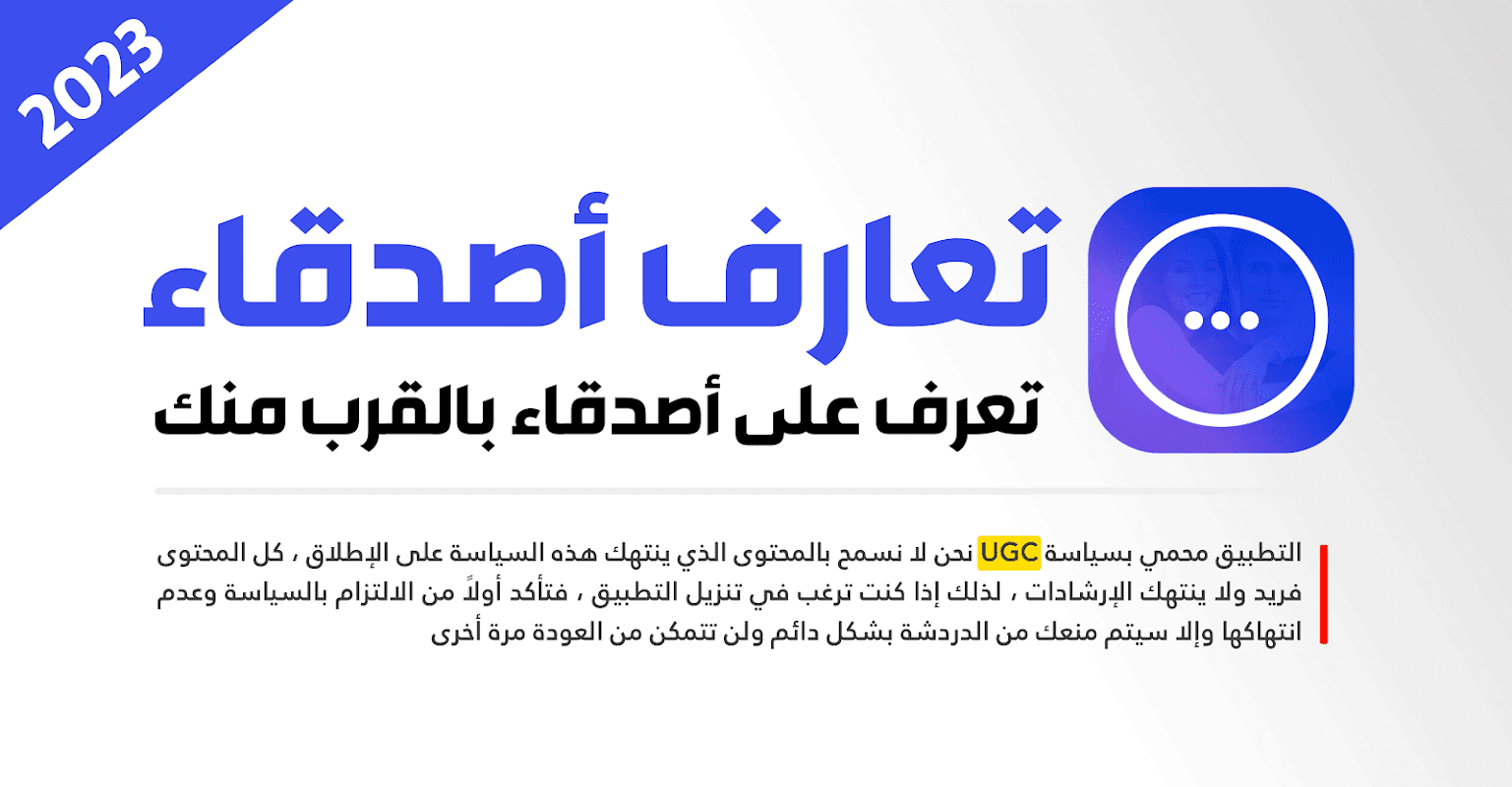 Trò chuyện hẹn hò với bạn bè ở gần bạn miễn phí. Nó cũng cho phép bạn có những cuộc trò chuyện tuyệt vời với nhiều người dùng từ các quốc gia Ả Rập khác nhau mà không có ngoại lệ, đồng thời bạn có thể gửi và nhận yêu cầu kết bạn trong một cuộc trò chuyện bằng tiếng Ả Rập bao gồm hàng nghìn người dùng.