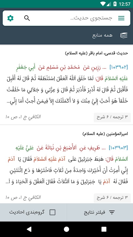 Chương trình Hadith toàn diện là phiên bản di động của Cơ sở dữ liệu Hadith toàn diện (https://hadith.inoor.ir) cung cấp quyền truy cập vào tài nguyên của Shiite hadith cho sinh viên, nhà nghiên cứu và những người quan tâm đến khoa học của Hadith và những lời dạy của Ahl al-Bayt. Trong phần mềm này, ngoài việc cung cấp một bộ sưu tập các bài tường thuật có sẵn trong 199 tiêu đề của các nguồn hadith - bao gồm khoảng 400.000 bài tường thuật và bản dịch và giải thích được viết trên chúng - các tài liệu thuyết minh và tài liệu tường thuật liên quan cũng được cung cấp. Ngoài ra, các phương tiện nghiên cứu như tìm kiếm trong văn bản của hadiths, tạo giá sách, chèn chỉ mục trên hadith, v.v. đã được cung cấp. Bạn có thể sử dụng thông tin được lưu trữ ngoại tuyến trong các phần "Hadiths mới nhất", "Mục ưa thích" và "Chỉ mục" ngoại tuyến sau khi ngắt kết nối mạng.