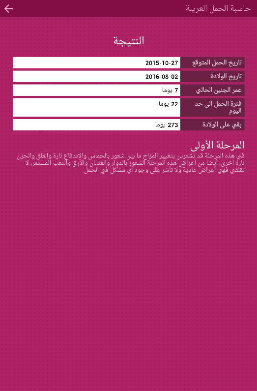 Ứng dụng Máy tính thai Arab phụ nữ mang thai đặc biệt cung cấp cho các chi tiết của việc mang thai và ngày tháng năm sinh, vv