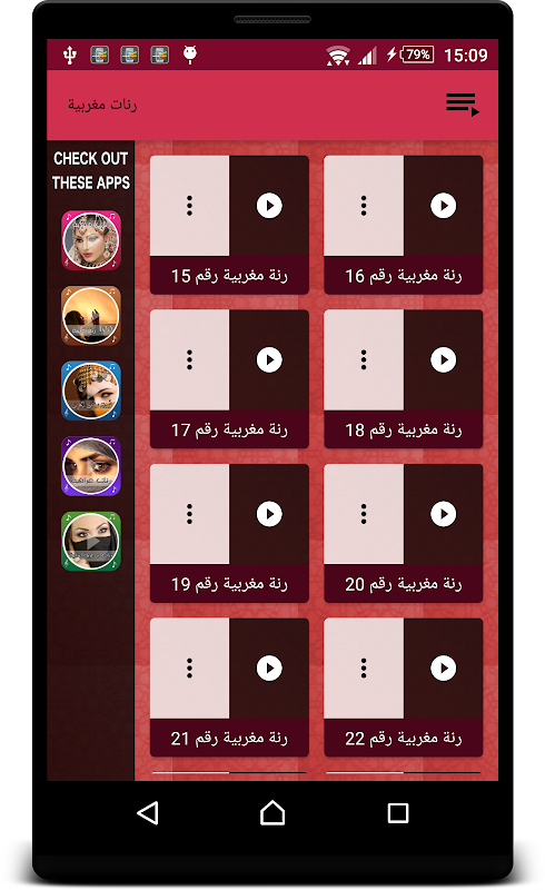 Ứng dụng này bao gồm một nhóm các bài hát Ma-rốc dành cho các ca sĩ nổi tiếng nhất trong làng nghệ thuật: