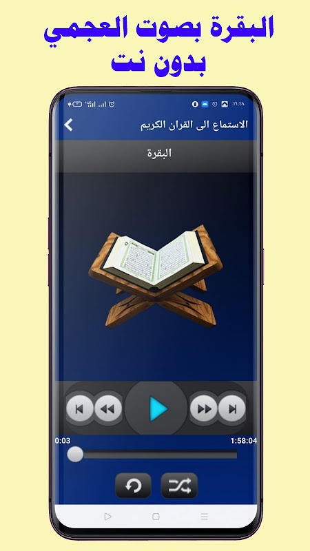 ✔عند ذلك يمكنك فتح التطبيق والاستماع إلى سورة البقرة بصوت أحمد العجمي. ولن تحتاج أن تتصل اونلاين بشبكة الانترنت