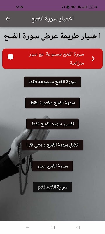 Surat Al-Fath: Surat Al-Fath, toàn diện. Một ứng dụng cũng bổ sung thêm Surat Al-Fath trong dấu phụ, phần đầu của Surat Al-Fath, câu cuối cùng trong Surat Al-Fath và câu cuối cùng trong Surat Al-Fath .