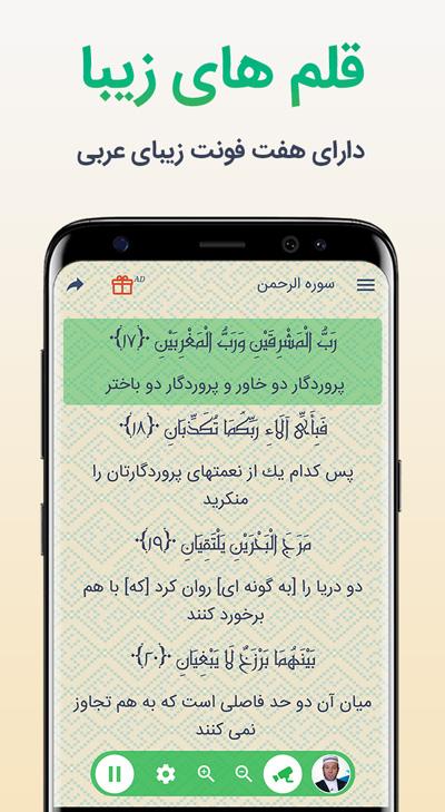 با صدای عبدالباسط، پرهیزگار، محمد جبرییل و همراه با ترجمه صوتی هدایت فر. با ظاهری مدرن، بدون نیاز به اینترنت با اسکرول ( پیمایش ) خودکار و همراه با تم شب. بر اساس برخی روایات اگر کسی سوره الرحمن را قرائت کند، خداوند توفیق شکرگزاری به او میدهد و اگر در آن روز یا شب از دنیا برود شهید محسوب میشود.