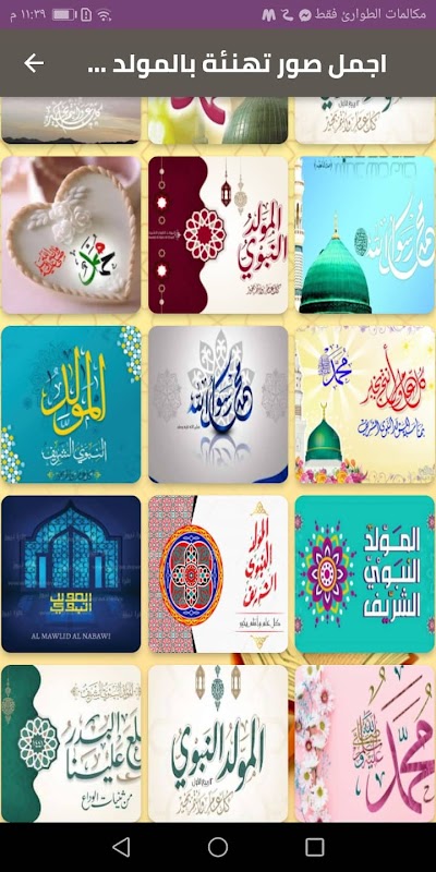 Ứng dụng này chứa một bộ sưu tập thẻ và hình nền độc đáo và hiếm có cho ngày sinh của Nhà tiên tri với thông báo và lời khen ngợi của Nhà tiên tri Muhammad, cầu Chúa phù hộ và ban cho anh ta sự bình an, và cũng bao gồm một bộ hình ảnh cho ngày kỷ niệm sinh nhật của Nhà tiên tri.