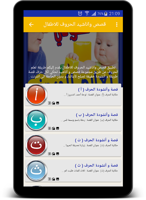 أفضل تطبيق لتعليم الحروف العربية للأطفال بطريقة سهلة ومسلية عبارة عن قصص و أناشيد لكل حرف.