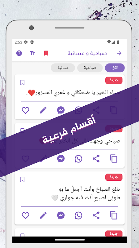- Các phần của ứng dụng "ấn phẩm buổi sáng, ấn phẩm buổi tối, ấn phẩm Hồi giáo, ấn phẩm Duas an ủi trái tim, bài đăng chúc mừng hôn nhân, ấn phẩm chúc mừng đính hôn,