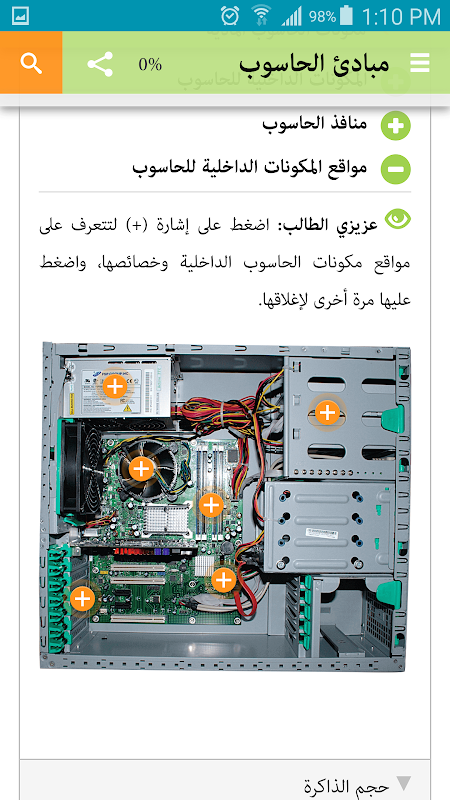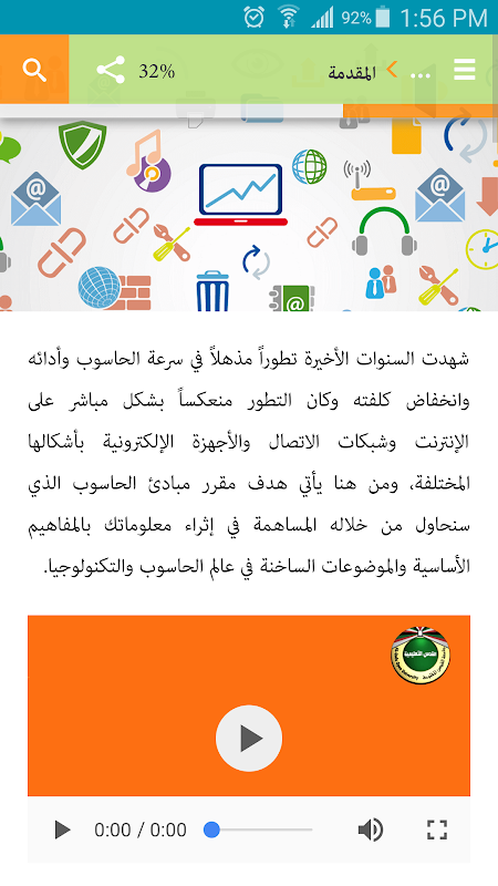 ويتناول التطبيق الموضوعات الرئيسة التالية: أساسيات نظام الحاسوب ومكوناته المادية والبرمجية وأنظمة العد الثنائية، ومفهوم نظم التشغيل، والإنترنت، انتهاءً بالتطبيقات العملية والتي تضم ثلاث برمجيات من حزمة الأوفيس.