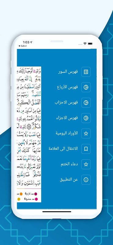 Khi bạn nhấp vào màn hình một lần, một tập hợp các tùy chọn màn hình cơ bản sẽ xuất hiện, đó là tên của surah, số lượng của bữa tiệc và phần bạn đang ở ngoài biểu tượng tìm kiếm mà bằng cách nhấp vào nó, bạn có thể tìm kiếm với bất kỳ từ nào để hiển thị tất cả các kết quả có thể có và nếu người dùng muốn có được kết quả chính xác hơn cho tìm kiếm thì sao? Anh ta chỉ nên viết càng nhiều từ của câu càng tốt vào trường tìm kiếm. Chúng ta cũng có một biểu tượng của menu chính, thông qua đó, menu chính được truy cập, lần lượt chứa một nhóm các chỉ mục quan trọng, bao gồm chỉ mục Surah, chỉ mục của các chương, chỉ mục của các bộ phận, các chữ viết tắt và chỉ mục quan trọng khác. .