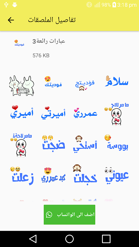 • وبعد ذلك تقوم بفتح هذا التطبيق ملصقات وتساب وتختار باقة الملصقات المناسبة لك وتنقر على اضف الى الواتس اب .
