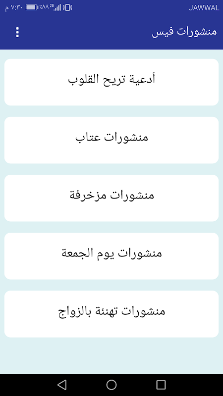 - اقسام التطبيق " منشورات صباحية,منشورات مسائية, منشورات اسلامية, منشورات ادعية تريح القلوب, بوستات تهنئة بالزواج, منشورات تهنئة بالخطوبة,