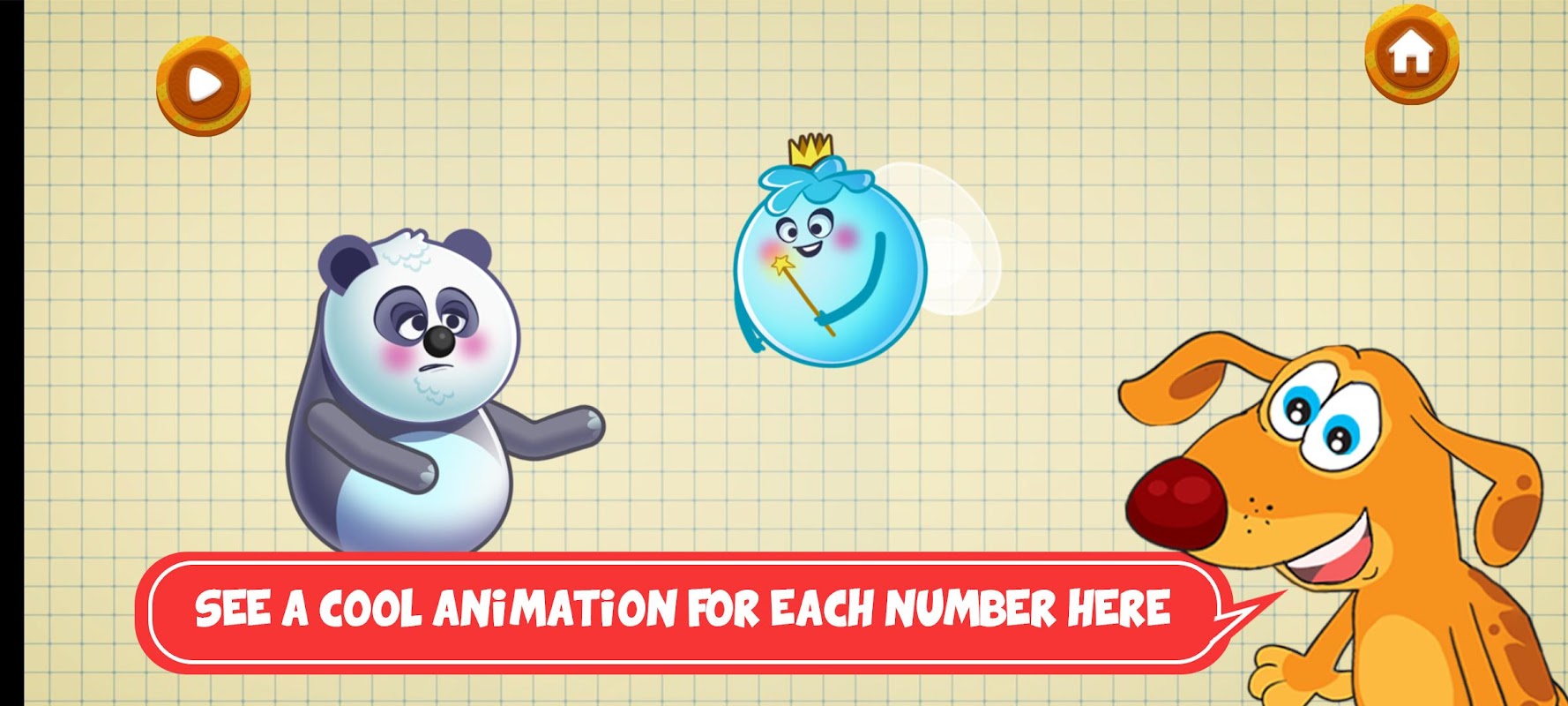 Ứng dụng này dạy trẻ em các số từ một đến hai lăm bằng tiếng Anh, bao gồm các trò chơi để thu thập và học cách phát âm. Ở cuối hướng dẫn, mỗi số sẽ thấy một hình ảnh động liên quan