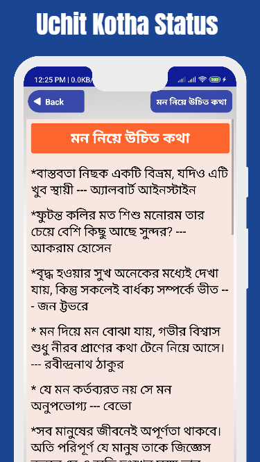 বাস্তব কথা একটু তেতো শুনা গেলেও আসলে তার গুরুত্ত্ব অনেক। বাস্তব কথা স্ট্যাটাস নিয়ে আমাদের এই অ্যাপটি আপনাদের নিশ্চয়ই ভালো লাগবে। ইসলামিক জ্ঞানের আলো পেতে চাইলেও আমাদের অ্যাপটি পছন্দ করতে পারেন। এই অ্যাপ পড়ার সময় বাস্তব জীবনের উক্তি ছবি সহ কল্পনার জগতে চলে যেতে পারেন। বাস্তব জীবনের কষ্টের কিছু কথা আছে এখানে।