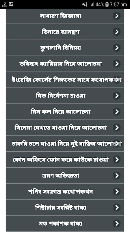 Spoken English Conversation in Bangla কোথায় কোন ইংরেজি বলবেন অ্যাপটি আসলে ইংরেজিতে কথা বলার সহজ উপায় হিসেবে কাজ করবে। এই ইংলিশ স্পিকিং কোর্স এর মাধ্যমে আপনি খুব সহজেই দৈনন্দিন জীবনে ব্যবহৃত ইংরেজি বাক্যের বাংলা অনুবাদ জানতে পারবেন। আমি কিভাবে ইংরেজি বলতে পারি যারা বলেন তাদের বলব ইংরেজিতে কথা বলার সহজ কৌশল হচ্ছে ইংরেজিতে কথোপকথন অনুশীলন করা। কেননা, আপনি যতই উচ্চারণসহ ইংরেজি শব্দার্থ শিখুন , যতই ইংলিশ গ্রামার শিখুন ইংলিশ ডায়ালগ না জানলে আপনি কথা বলতে গেলে আটকে যাবেন।