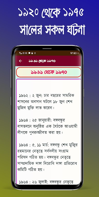 Theo ngày trong tiểu sử của Bangabandhu, tất cả các sự kiện của năm 1920-1975 đều được cập nhật theo ngày tháng trong ứng dụng.