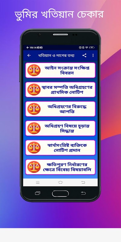 আমাদের এই এ্যপটি বাংলাদেশের সকল জমির খতিয়ান বের করে দিবে। আপনি শুধু আপনার খতিয়ানের নাম্বার অথবা সংশিষ্ট মৌজার দাগ নাম্বার দিবেন, বিস্তারিত খতিয়ান চলে আসবে। ঘরে বসে আপনার ভূমির খতিয়ানের সকল তথ্য পেতে এই এপটি ব্যবহার করুন, একই সাথে এই এপে পাবেন নামজারী বা নাম খারিজ, নামজারির অপশন।