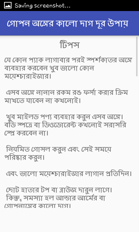 অনেকের গোপন অঙ্গে কালো বিশ্রী দাগ দেখা দেয় । যা কিনা অপ্রীতিকর এবং বিরক্তীকর একটি ব্যপার । সঙ্গীনীর কাছে গেলে হয়ত লজ্জা পেতে হয় এই দাগের জন্য । এই দাগ কিভাবে সহজে দূর করবেন সেই টিপ্স নিয়েই আমাদের এই এপ্স ।