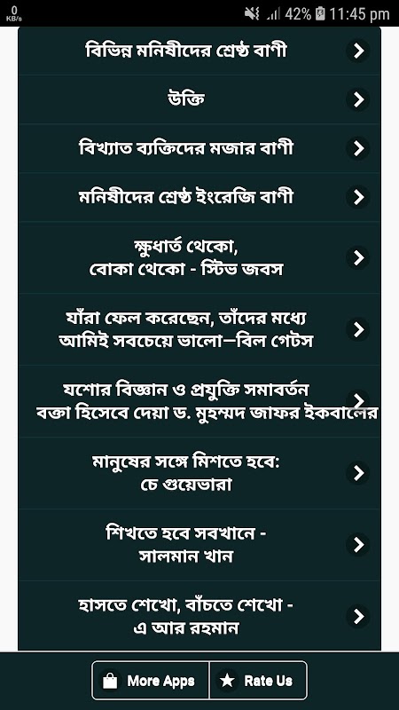 Bangla bani / bangla quotes/ bikkhatoukti/ bangla ukti / bangla quotation is a bangla apps which is a collection of inspirational quotes in bangla. In this bikkhato ukti bangla apps hundreds of “quotation in bangla”, quotes in bengali , bengali quotation, bengali quotes are included. There are lots of famous people out there. Their famous quotes bangla is accumulated in this “quotation in bengali” app. In bengali famous persons are called bikkhato or monishi. So this bangla app can be named as bikkhato ukti, monishider ukti, bangla ukti, bangla bani, banglay bani, banisomogro etc. The key persons included in this bangla quotes/ bangla quotation/ quotes in bengali/ quotation in bengali /bangla bani