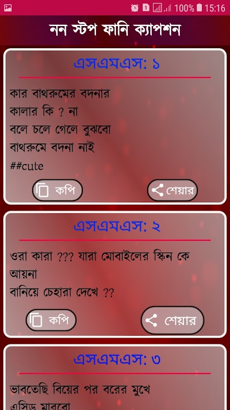 অ্যাপটিতে আরো আছে মেয়েদের খুশি করার এসএমএস। মেয়েদের কেনা খুশি করতে চায় তাদেরকে খুশি করতে হাসানো দরকার হাসানোর জন্য মজার মজার sms আমাদের অ্যাপটিতে পাবেন। তাই এখনই অ্যাপটি ডাউনলোড করুন ।