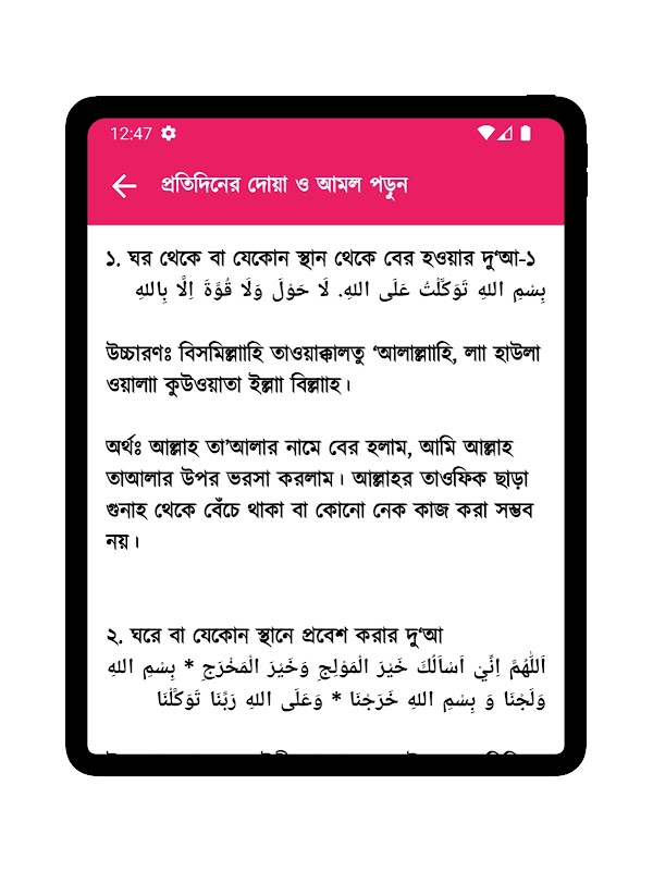 Các Duas thiết yếu hàng ngày được sắp xếp bằng tiếng Ả Rập cùng với Phát âm tiếng Bengali và Ý nghĩa tiếng Bengali. Ứng dụng này chứa những lời cầu nguyện và việc làm buổi sáng và buổi tối. Dua để tìm kiếm sự hướng dẫn từ Allah, dua vì phúc lợi chung của thế giới và mai sau, dua cho cha mẹ và con cái, dua để được cứu khỏi nguy hiểm, thiên tai và khan hiếm, dua để thoát khỏi bệnh tật và các vấn đề về tâm thần. Dua trước khi vào nhà vệ sinh, dua đọc trước khi ngủ, dua hắt hơi, dua vào nhà thờ. Ngoài ra còn có những câu thơ của Ruqiya được mô tả trong Kinh Qur'an và Duas của Ruqiya được mô tả trong Hadith, dua được đọc trong khi cầu nguyện và dua được đọc sau lời cầu nguyện. Sayyedul Istighfar, Darood Sharif, Kalima, Kunute Najela, Munajate Maqbool bao gồm tất cả các dua cần thiết cần được ghi nhớ và đọc thuộc lòng thường xuyên trong cuộc sống hàng ngày của chúng ta.