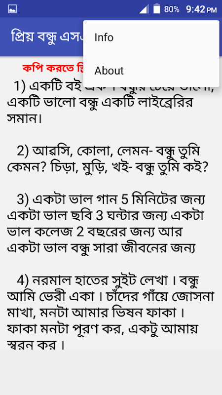 This is a New Bangla Text SMS Messaging Application. Through this app you can Copy and send Bangla Text SMS Message with your friends and family. This application based on Bengali interface. You can Copy and Share all of the messages within your social media.