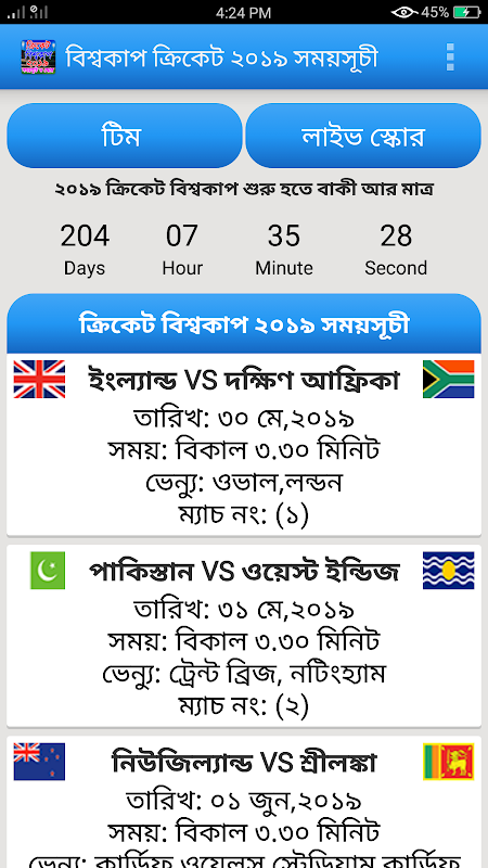 বিশ্বকাপ ক্রিকেট ২০১৯ সময়সূচী ও লাইভ স্কোর 1.25