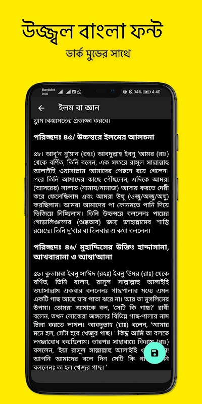 Ứng dụng Android Bukhari Bangla FullBook với Tìm kiếm, Đánh dấu ở chế độ sáng và tối.