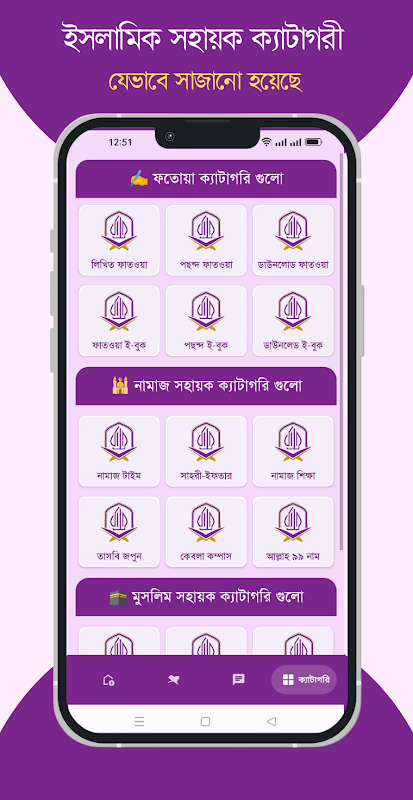 Ứng dụng Kinh Qur'an ở Bangla, ứng dụng thời gian Namaz, ứng dụng Hồi giáo Bangladesh, thời gian Ramadan, Tasbeeh kỹ thuật số, ứng dụng hướng Qibla, Duas, 99 tên của Allah, ứng dụng Kalima, ứng dụng fatwa Hồi giáo, hướng dẫn Bangla Hajj, máy tính Zakat Bangla